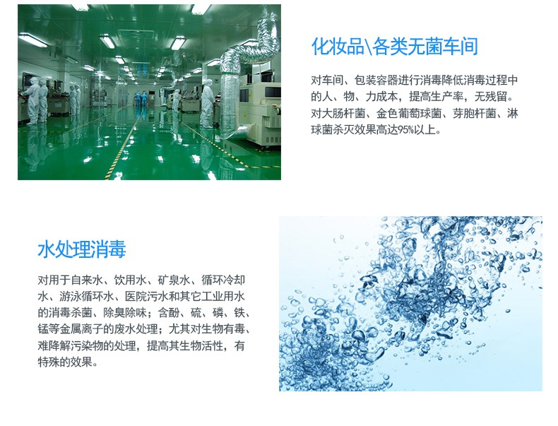 殺菌可用于:上、下水,游泳池水,飲料水等的殺菌消毒;食品貯藏室內(nèi)殺菌消毒:醫(yī)院、學(xué)校、幼兒園、辦公室、食品加工廠、制藥廠等空氣凈化;器具類殺菌消毒,醫(yī)院污水、生活污水的殺菌消毒等等。TtP臭氧發(fā)生器_臭氧消毒機(jī)_臭氧水機(jī)_制氧機(jī)_廣州佳環(huán)電器【官網(wǎng)】